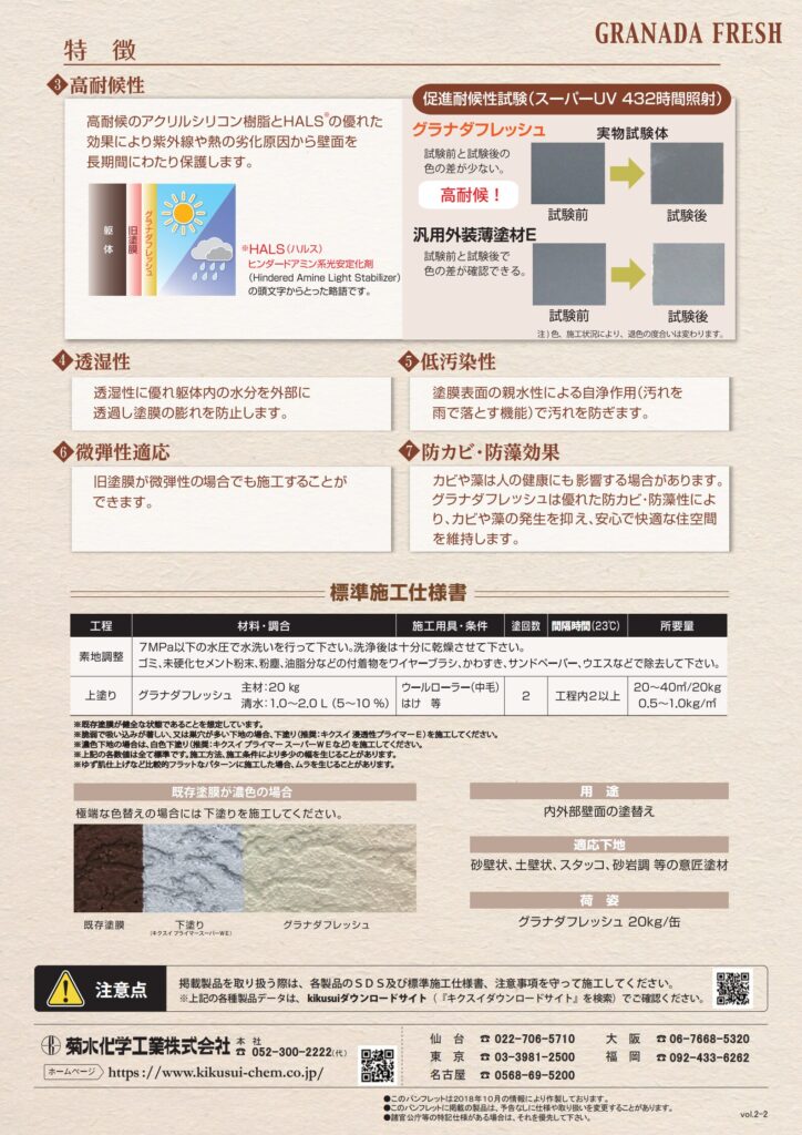 - 耐候性のアクリルシリコン樹脂とHALSの優れた効果により紫外線や熱の劣化原因から壁面を保護します。