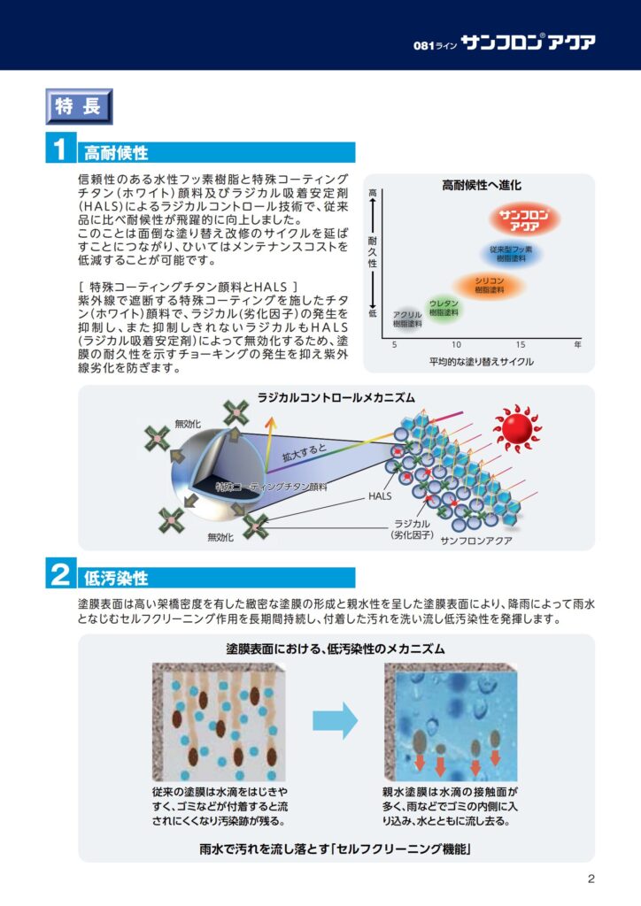 - 信頼性のある水性フッ素樹脂と特殊コーティングチタン顔料及びラジカル吸着安定剤により、耐候性が飛躍的に向上しました。