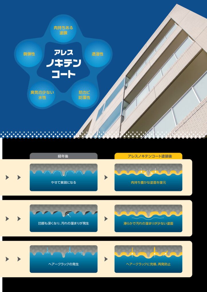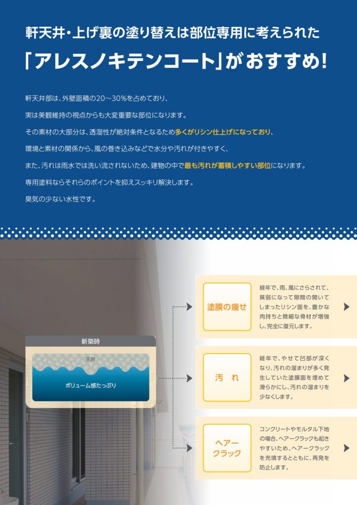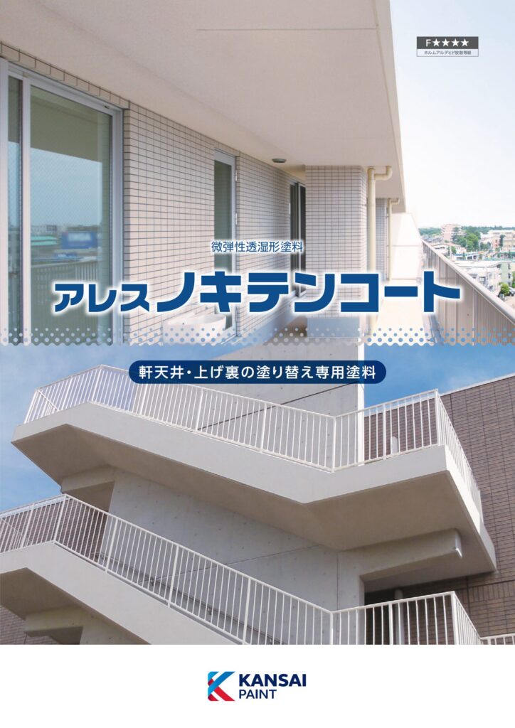 fujitoso-man 軒天井塗替専用塗料アレスノキテンコート 関西ペイント株式会社 特徴・機能 有機リシン・無機リシンの凸凹面を一回塗りで塗り替えが可能です。 素地コンクリートの中性化を防止します。 仕上がりは平滑で、耐久性が優れています。 透湿性に優れています。 防カビ、防藻性がありますので、湿気や気流の溜りやすい部位に 生じるカビや藻の発生を防止します。