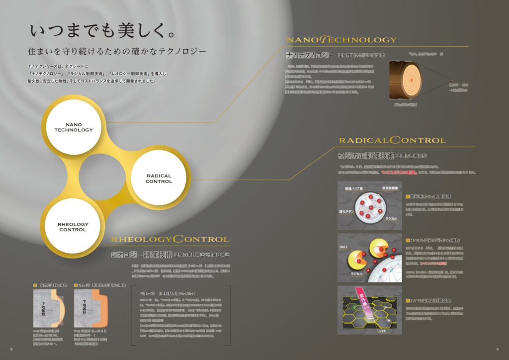 - (ナノシリコンテクノロジー)アクリル成分とシリコン成分をナノスケールで均一に融合させ、シリコン樹脂のポテンシャルを最大限まで引き出すことで優れた耐久性を発揮!!