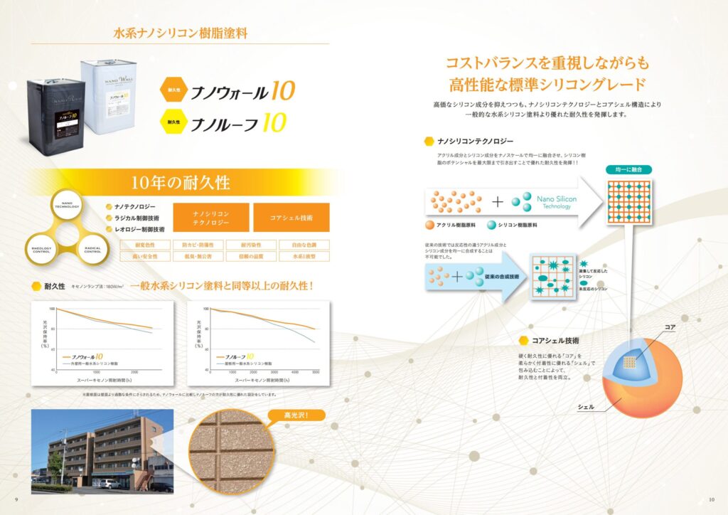 - 高価なシリコン成分を抑えつつも、ナノシリコンテクノロジーとコアシェル構造により一般的な水系シリコン塗料より優れた耐久性を発揮します。