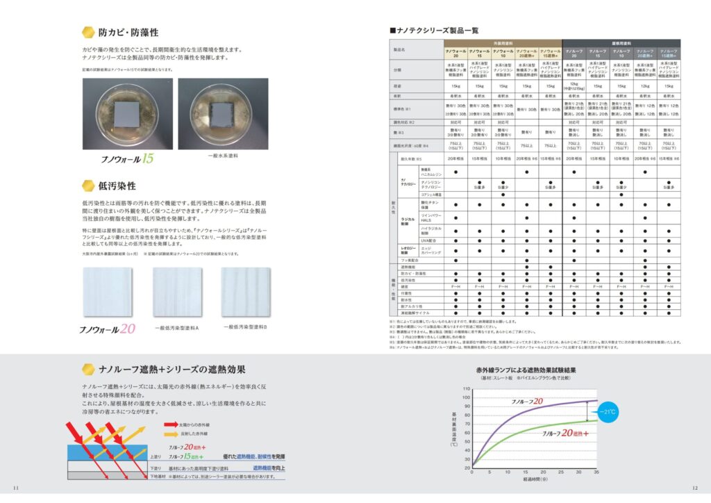 - 低汚染性とは雨筋等の汚れを防ぐ機能です。低汚染性に優れる塗料は、長期間に渡り住まいの外観を美しく保つことができます。ナノテクシリーズは全製品当社独自の樹脂を使用し、低汚染性を発揮します。