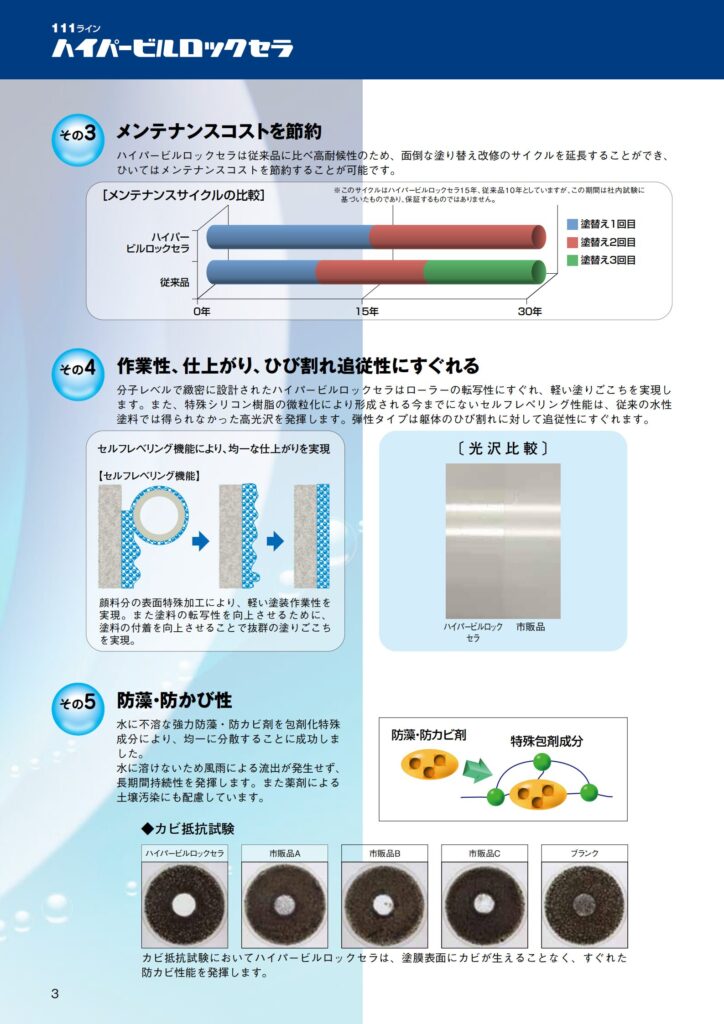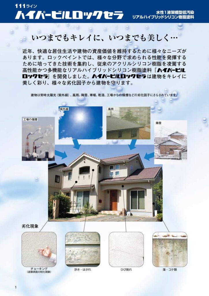 - 当社独自のリアルハイブリッドシリコン樹脂と、特殊コーティングチタン顔料及びラジカル吸着安定剤(HALS)によるラジカルコント