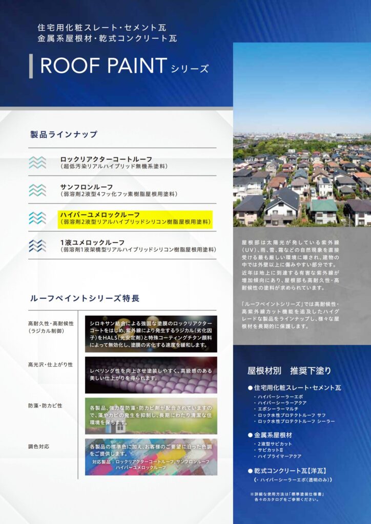 fujitoso-man 弱溶剤2液型リアルハイブリッドシリコン樹脂屋根用塗料ハイパーユメロックルーフ ロックペイント株式会社 特徴・機能 特殊三元ハイブリッド形アクリルシリコン樹脂と特殊コーティングチタン(ホワイト)顔料及びラジカル吸着安定剤(HALS)の効果 により、すぐれた耐候性・耐久性を発揮します。 特殊成分配合により親水性の高い塗膜を形成し、汚染物を降雨により浮かせ流します。