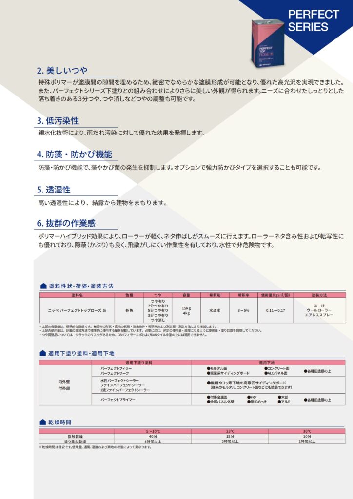 - ポリマーが塗膜間の隙間を埋めるため、緻密でなめらかな塗膜が形成可能となり、すぐれた高光沢を実現できました。また、パーフェクトシリーズの下塗りとの組み合わせにより、さらに美しい外観が得られます。ニーズに合わせ、しっとりとした3分つや、つや消しなど、つやの調整も可能です。