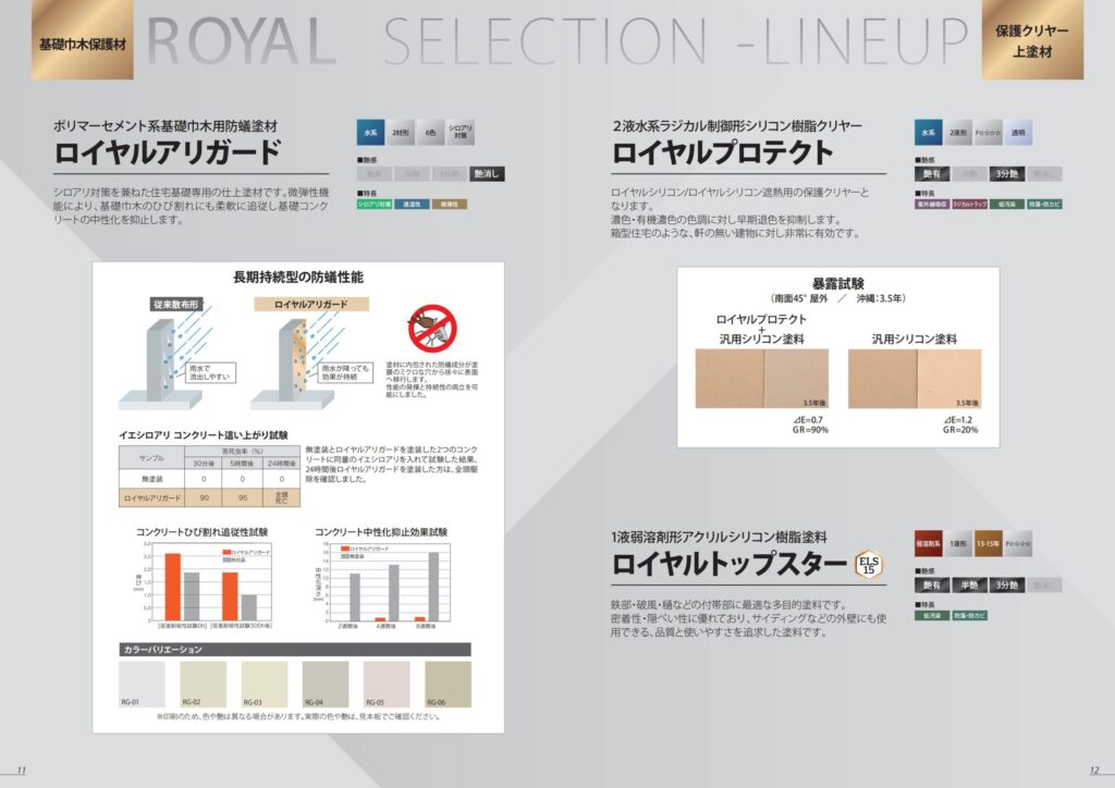 fujitoso-man ポリマーセメント系基礎巾木用防蟻塗材ロイヤルアリガード 菊水化学工業株式会社 特徴・機能 シロアリ対策を兼ねた住宅基礎専用の長期持続型防蟻塗材です。 微弾性の仕上塗材です。細かいひび割れに追従し中性化抑止します。 防藻・防カビ性、透湿性に優れています。透湿性は、外装材内部の湿気を逃がす効果により、塗膜の膨れや基材自体の劣化などを抑止します。 高密着性の主材着色タイプ仕上塗材のため、下塗り・上塗り不要です。