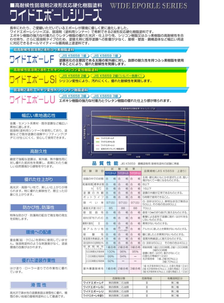 fujitoso-man シ弱溶剤2液形エポキシ変性アクリルシリコン樹脂系塗料ワイドエポーレSi スズカファイン株式会社 特徴・機能 弱溶剤2液形エポキシ変性アクリルシリコン樹脂系つやあり塗料です。 エポキシ樹脂による付着性の高い塗料です。 シリコン変性により、汚れにくく、優れた耐候性を実現します。 優れた密着性を有する2液タイプです。 さびが発生していないトタンには直接塗装が可能です。