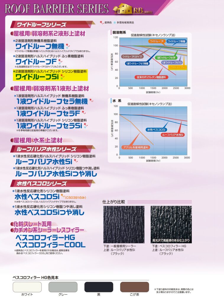 fujitoso-man <HALS> 屋根用 弱溶剤2液形アクリルシリコン樹脂系塗料ワイドルーフSi スズカファイン株式会社 特徴・機能 <HALS> 屋根用 弱溶剤2液形アクリルシリコン樹脂系つやあり塗料です。 アクリルシリコン樹脂と光安定剤(HALS)を用いた強靭で光沢保持力の高い塗膜です。 驚くほど肉持ちが良く高光沢の塗膜です。 優れた密着性を有する2液タイプです。 さびが発生していないトタンには直接塗装が可能です。